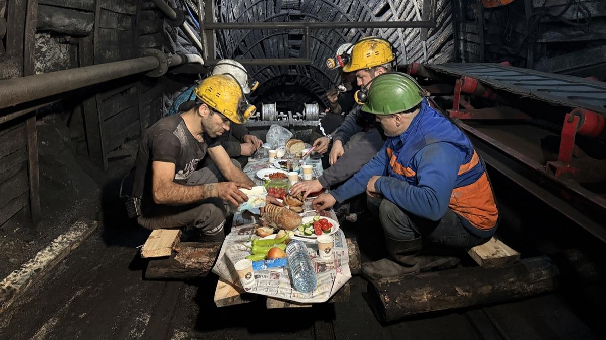 Baretlerinin ışığının aydınlattığı ocak içinde ilk sahurlarını yapmanın heyecanını yaşayan maden işçileri, yanlarında getirdikleri domates, salatalık, soğan, biber, peynir, zeytin, konserve ve ekmeği kömürden kararmış elleriyle yedi.
