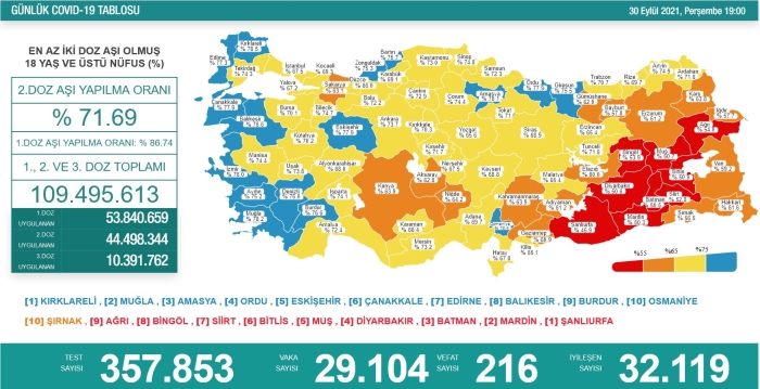 18 yaş üstü nüfusta ikinci doz aşı uygulananların oranı yüzde 71,69, birinci doz aşı yapılanların oranı yüzde 86,74 olarak kayıtlara geçti.