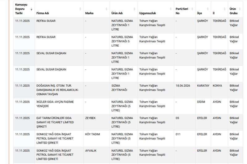 Öte yandan "naturel sızma zeytinyağı" adıyla sunulan birçok ürüne tohum yağlarının karıştırıldığı bilgisine de yer verildi.