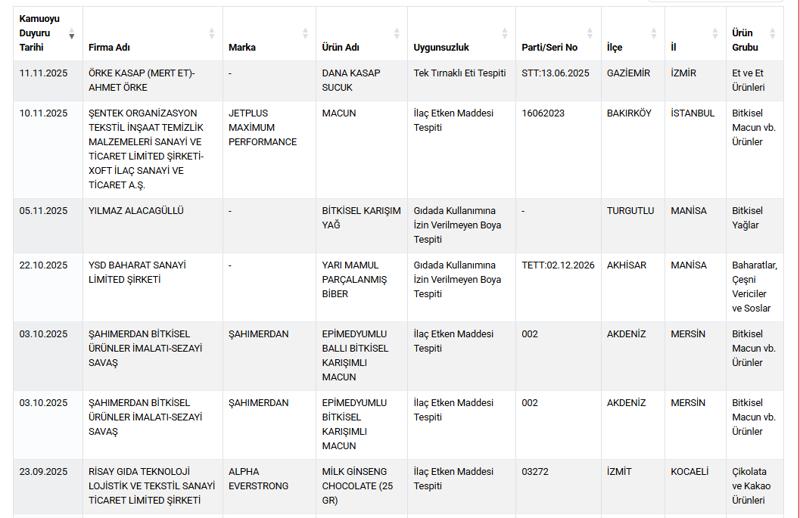 Listeye yeni eklenen dana kasap sucuk ürününde tek tırnaklı eti, macun ürününde ise ilaç etken maddesi tespit edildi.