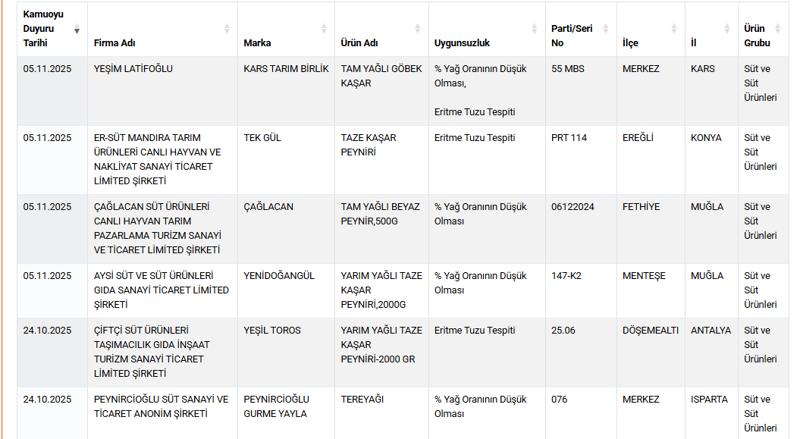 Listedeki ürünlerde, kanatlı eti, sakatat ve tek tırnaklı tespiti ile taklit, tağşiş ve bitkisel yağ tespiti gibi birçok uygunsuzluk yer alıyor.