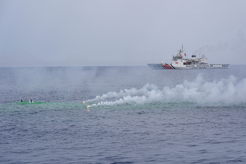 Tatbikatı, Sahil Güvenlik Komutanı Tümamiral Ahmet Kendir ile 15 ülkeden 28'i yabancı toplam 39 gözlemci ile basın mensupları, TCSG Umut gemisinden takip etti.