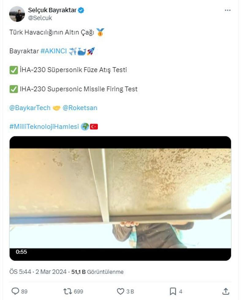 Bayraktar AKINCI TİHA'nın füze atışı hakkında sosyal medya hesabından paylaşımda bulunan Baykar Teknoloji Lider Selçuk Bayraktar, "Türk Havacılığının Altın Çağı, Bayraktar AKINCI, İHA-230 Süpersonik Füze Atış Testi" ifadelerini kullandı.