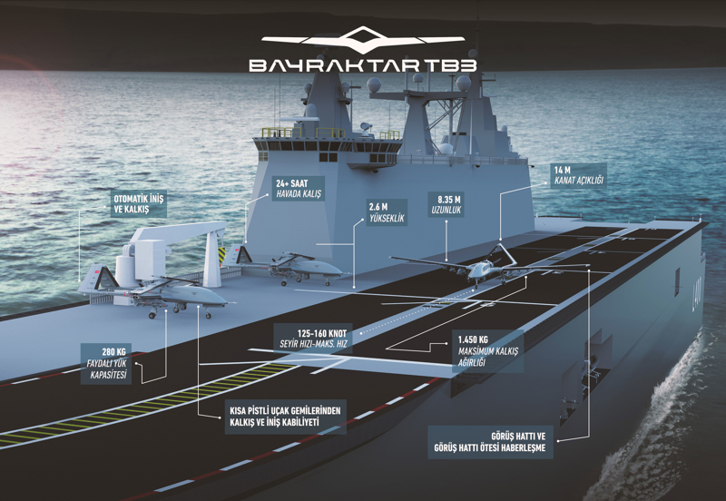 Baykar tarafından milli ve özgün olarak geliştirilen Bayraktar TB3 SİHA, kısa pistli gemilerden kalkış ve iniş kabiliyetine sahip silahlı insansız hava aracı sistemidir. Keşif-gözetleme ve istihbarat görevlerinin yanı sıra kanatları altında taşıdığı yerli akıllı mühimmatlarla operasyon icra etme kabiliyetine sahiptir.