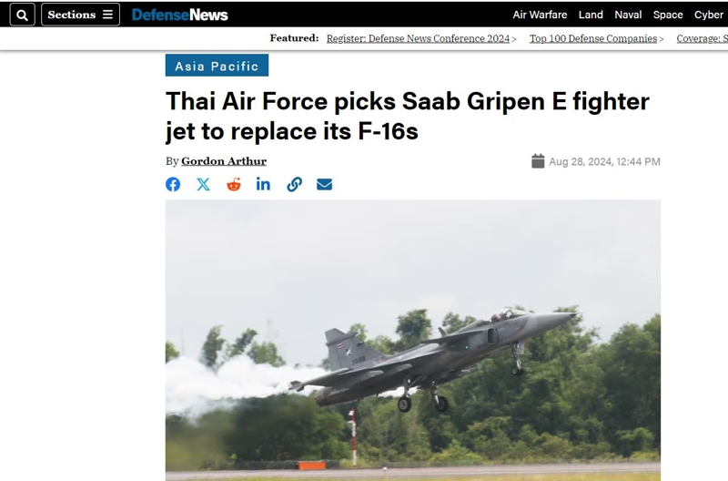 ABD merkezli savunma sanayi haber sitesi Defense News, Tayland Hava Kuvvetleri'nin eski F-16'larını değiştirmek için Saab Gripen E savaş uçağını seçtiğini iddia etti. Defense News'te yer alan habere göre, Tayland Kraliyet Hava Kuvvetleri için eski F-16A/B'lerinin yerini almak üzere Gripen E/F savaş uçağını aday gösterildi.