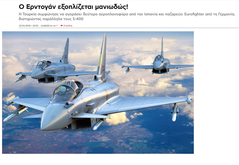 Cumhurbaşkanı Erdoğan'ın İspanya ziyaretini etkileyici olarak nitelendiren Yunan basını, "Türkiye ve İspanya TCG Anadolu'dan sonra ikinci bir uçak gemisinin ortak inşasının yanı sıra insansız denizaltıların inşası ve büyük İHA'ların üretimi konusunda resmi olarak taahhütte bulundular" ifadelerini kullandı.