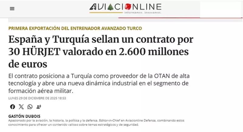 İspanya ile Türkiye arasında imzalanan 2,6 milyar euroluk HÜRJET anlaşması, İspanyol basınında geniş yankı uyandırdı. Türk Havacılık ve Uzay Sanayii (TUSAŞ) tarafından geliştirilen Türkiye'nin ilk milli jet eğitim ve hafif taarruz uçağı HÜRJET'in İspanya'ya ihracatını kapsayan anlaşma, "stratejik bir dönüm noktası" olarak değerlendirildi.