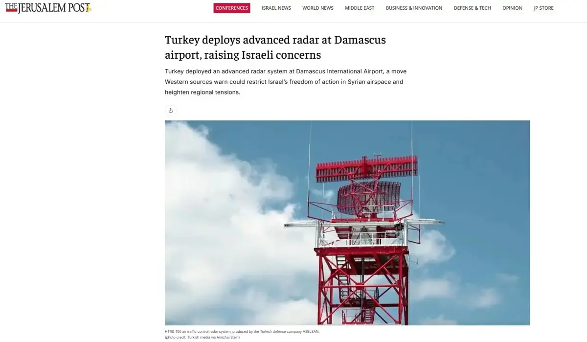 ASELSAN'ın Suriye'deki Şam Havalimanı'na kurduğu geliştirdiği HTRS-100 hava trafik kontrol radar sistemi İsrail'i endişeye sevk etti. Tel Aviv medyası, Türkiye'nin Şam Uluslararası Havalimanı'na radar konuşlandırmasında İsrail'in Suriye hava sahasındaki hareket özgürlüğünü kısıtlayabileceği ve bölgesel gerilimleri artırabileceğini yazdı.