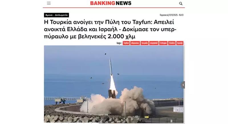 Farklı bir Yunan basını Banking News de TAYFUN füzesi hakkında çapıcı ifadeler kullandı. Atina basını haberine "Türkiye, TAYFUN Kapısı'nı açtı: Yunanistan ve İsrail'i açıkça tehdit ederek 2 bin kilometre menzile kadar çıkabilen süper füzeyi denedi" başlığını attı.