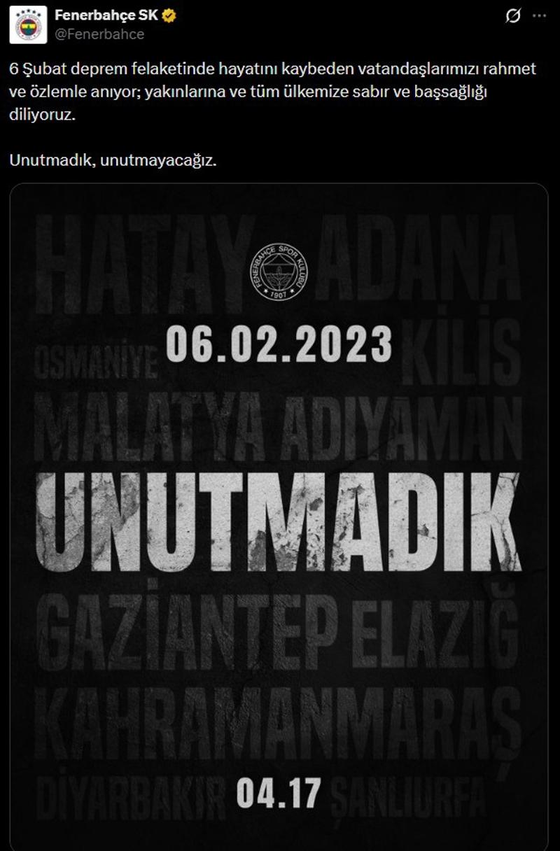 Beşiktaş Kulübünün paylaşımında, "Unutmadık. Unutmayacağız. 6 Şubat Kahramanmaraş depremlerinde yitirdiğimiz canlarımızı rahmetle anıyoruz. Bu tarifsiz acıların bir daha yaşanmamasını temenni ediyoruz." denildi.