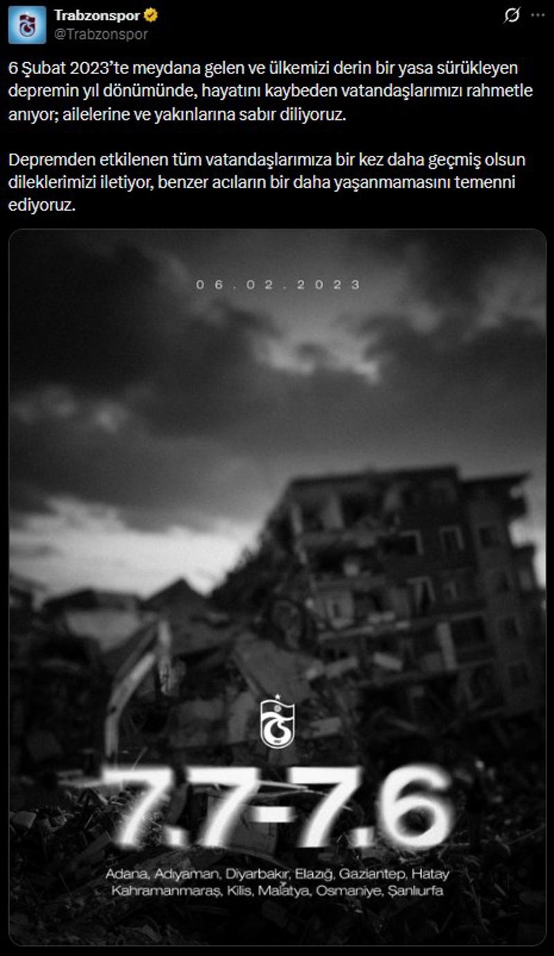 Türkiye Futbol Federasyonu'nun internet sitesinden yayımlanan mesajda, "6 Şubat 2023 tarihinde merkez üssü Kahramanmaraş olan ve 11 ilimizde yıkıcı izler bırakarak ülkemizi yasa boğan deprem felaketinin 3. yıl dönümünde, hayatını kaybeden vatandaşlarımıza bir kez daha Allah'tan rahmet; kederli ailelerine, yakınlarına ve aziz milletimize başsağlığı diliyoruz." ifadeleri kullanıldı.