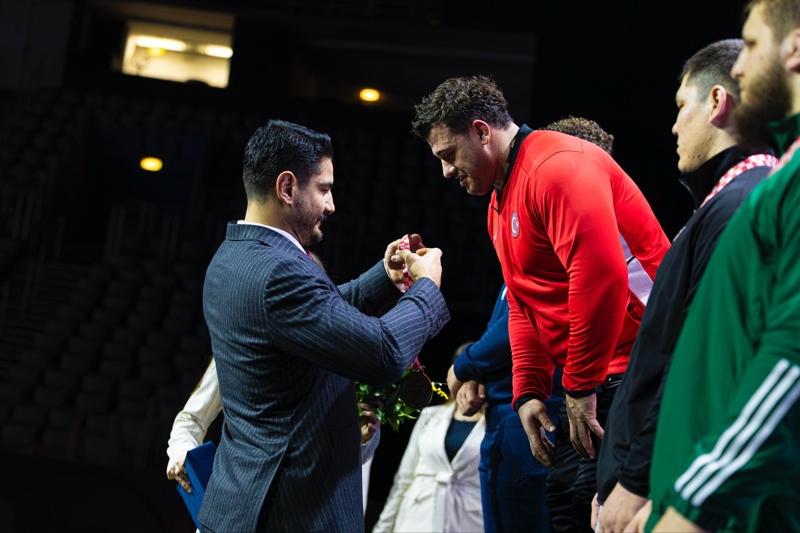 Rıza Kayaalp'e altın madalyasını Türkiye Güreş Federasyonu Başkanı Taha Akgül verdi.