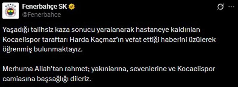 "Yaşadığı talihsiz kaza sonucu yaralanarak hastaneye kaldırılan Kocaelispor taraftarı Harda Kaçmaz'ın vefat ettiği haberini üzülerek öğrenmiş bulunmaktayız.