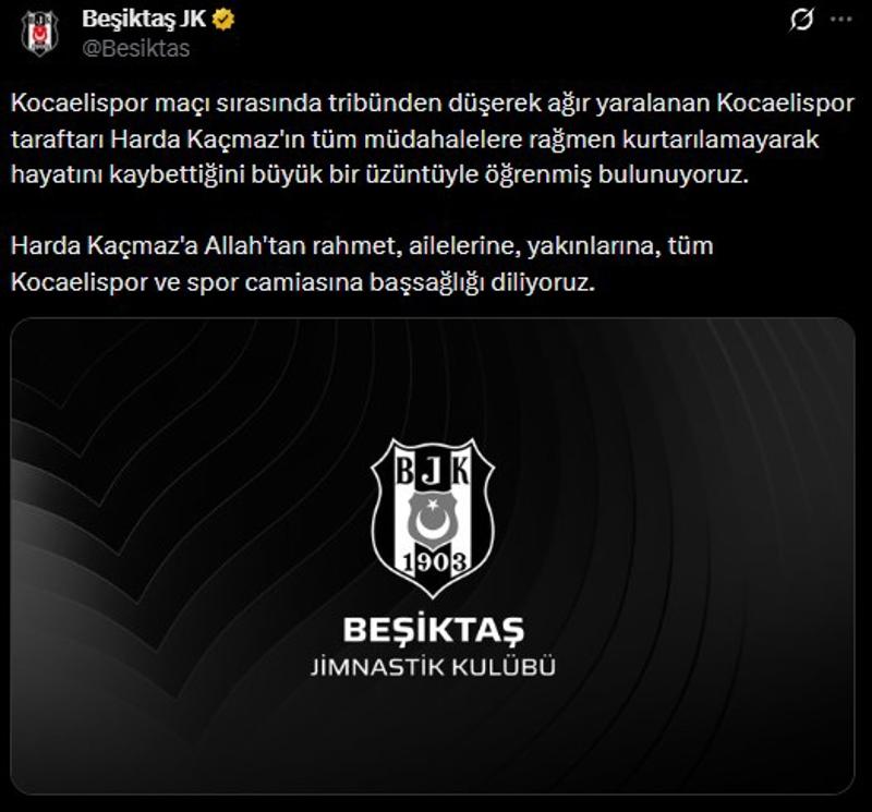Ziraat Türkiye Kupası'nda Kocaelispor, Beşiktaş ile karşı karşıya geldi. Kocaelispor, mücadelede tribünden düşerek yaralanan ve hastaneye kaldırılan Harda Kaçmaz'ın hayatını kaybettiğini açıkladı.