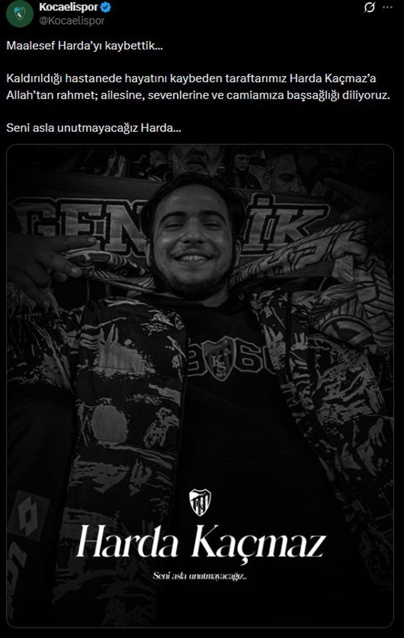 "Kocaelispor maçı sırasında tribünden düşerek ağır yaralanan Kocaelispor taraftarı Harda Kaçmaz'ın tüm müdahalelere rağmen kurtarılamayarak hayatını kaybettiğini büyük bir üzüntüyle öğrenmiş bulunuyoruz.