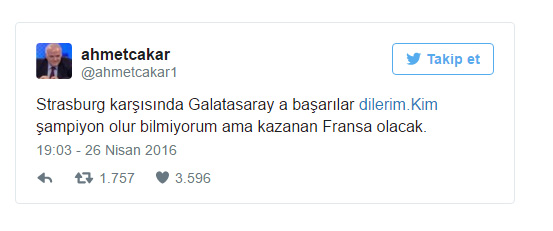 Ahmet Çakar, kişisel Twitter hesabından atıtğı tweette, "Strasbourg karşısında Galatasaray'a başarılar dilerim. Kim şampiyon olur bilmiyorum ama kazanan Fransa olacak" ifadesini kullandı.
