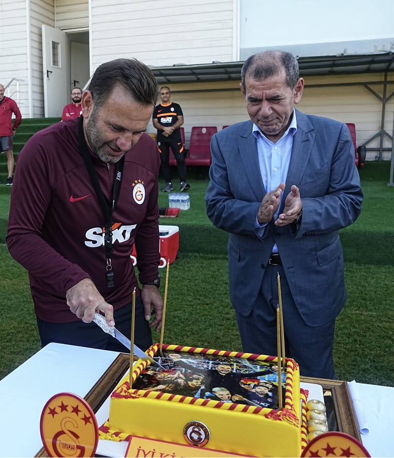 Buruk, üzerinde Mauro Icardi'nin kendisini omzuna aldığı şampiyonluk kutlamasının fotoğrafı bulunan doğum günü pastasını kesti. Başkan Özbek, tecrübeli teknik adama, şampiyonluk kutlamasından bir fotoğraf hediye etti.