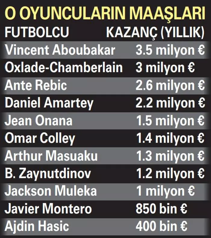 Beşiktaş'ta kadroda düşünülmeyen oyuncular arasında Kamerunlu Vincent Aboubakar, 3.5 milyon euroluk maaşıyla en masraflı oyuncu. Golcü futbolcuyu 3 milyon euroluk maaşıyla Alex Oxlade-Chamberlain ve 2.6 milyon euro ile Ante Rebic takip ediyor. Onana 1.5 milyon euro, Colley 1.4 milyon euro, Masuaku 1.3 milyon euro ve Zaynutdinov 1.2 milyon euro maaşları ile yine düşünülmeyen ve çok kazanan oyunculardan... Muleka 1 milyon euro, Beşiktaş'taki her sezonunu kiralık geçiren Montero 850 bin euro ve Hasic 400 bin euro maaş alıyor.