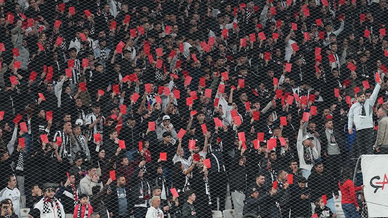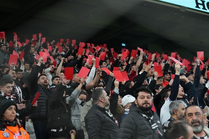 Kuzey kale arkasındaki siyah-beyazlı futbolseverler, maçtan önce ellerindeki kırmızı kartonlarla son haftalardaki hakem performanslarına tepki gösterdi.