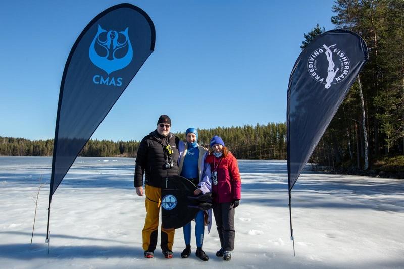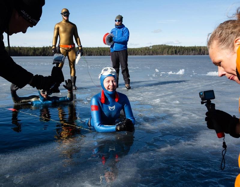 30 cm kalınlığındaki buz tabakasının altında, tek nefesle ve wetsuit ile monofin kullanarak 141 metre yatay mesafe kat eden Erken, CMAS dünya rekoru seviyesine ulaştı.