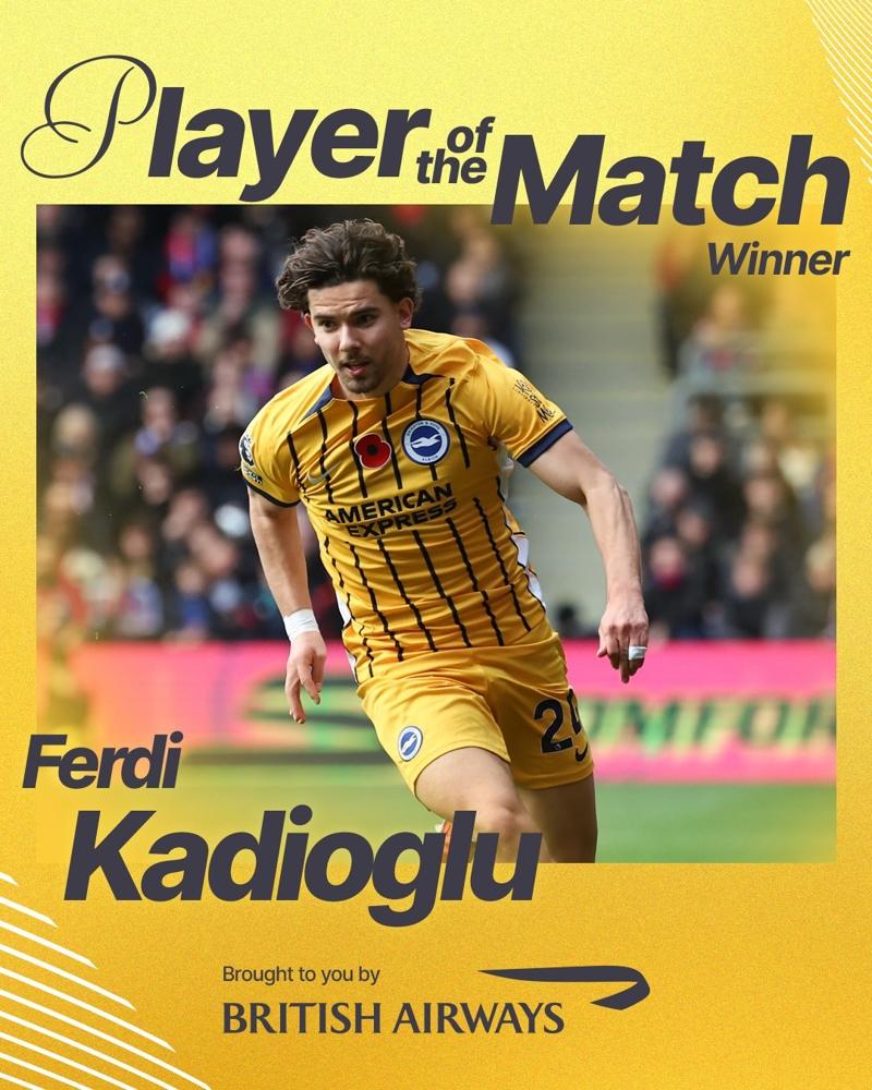Karşılaşmanın ardından Brighton, Ferdi Kadıoğlu'nun taraftarlar tarafından Crsytal Palace maçının en iyi oyuncusu seçildiğini açıkladı.