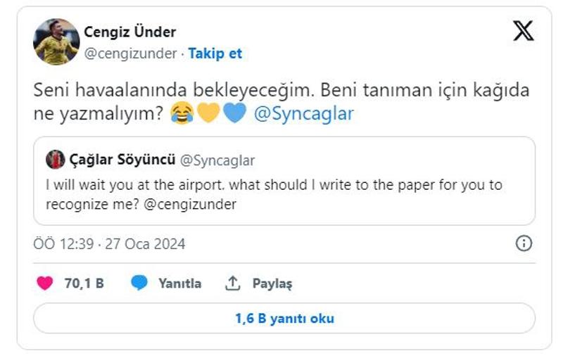 Roma'dan Leicester City'e kiralanan Cengiz Ünder için 2020'de, "Seni havaalanında bekleyeceğim. Beni tanıman için kağıda ne yazmalıyım" paylaşımını yapan Çağlar Söyüncü'ye yıllar sonra yanıt geldi.