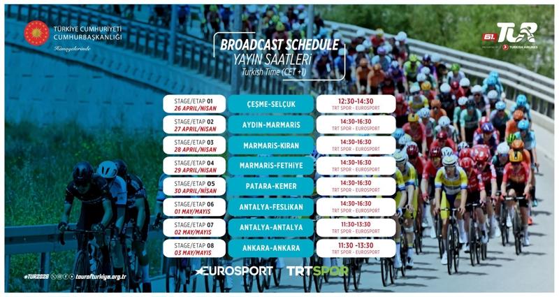61.Cumhurbaşkanlığı Türkiye Bisiklet Turu, TRT Spor ve Eurosport ekranlarından her gün ortalama 2 saat canlı yayınlanacak.