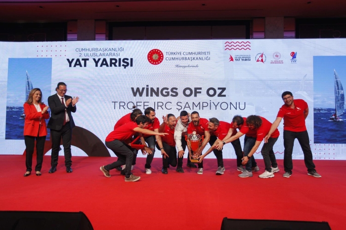 Wings of Oz takımına birincilik ödüllerini İstanbul Açıkdeniz Yat Yarış Kulübü Başkanı Ekrem Yemlihaoğlu ile Türkiye Yelken Federasyonu Başkanı Özlem Akdurak takdim etti.