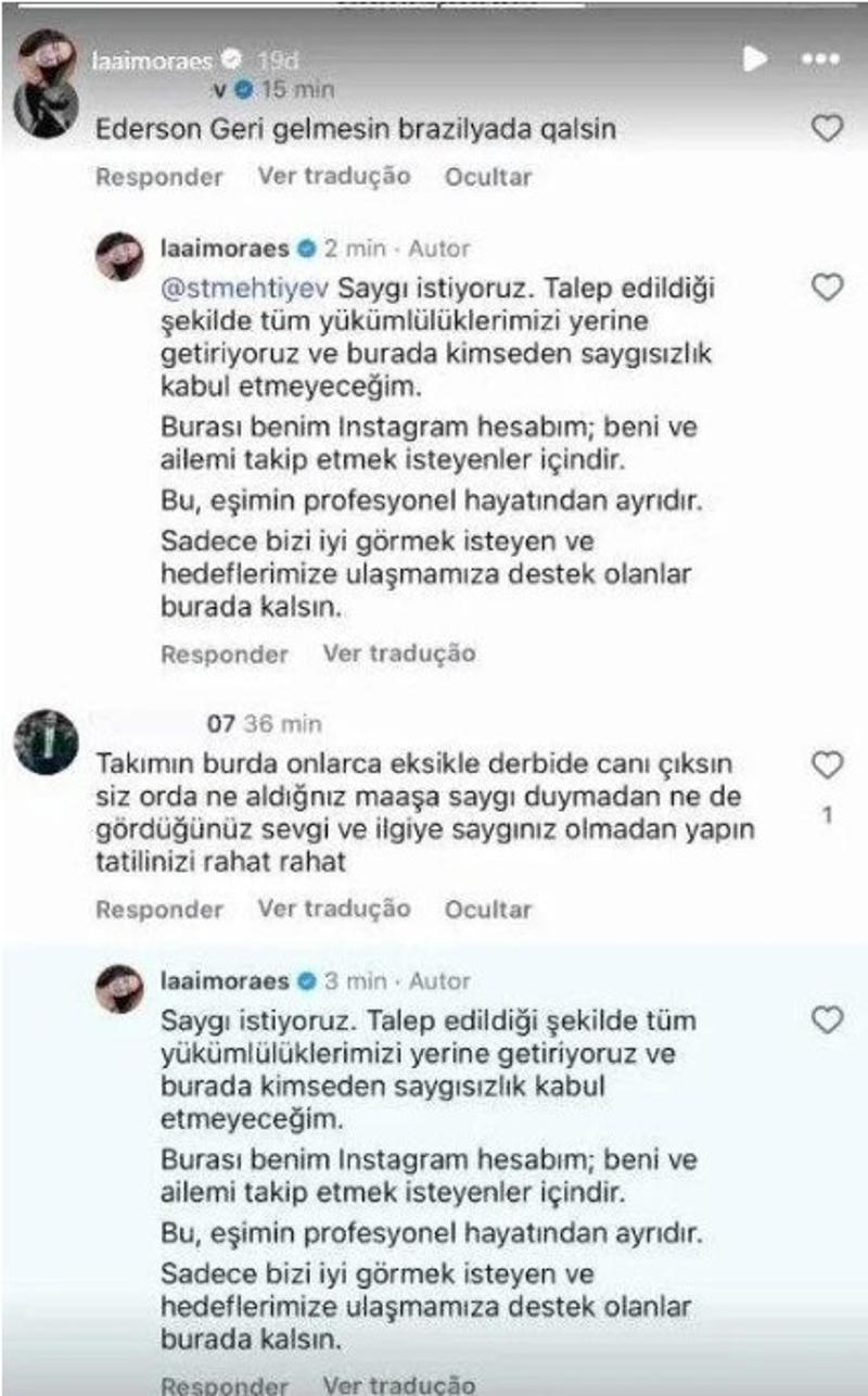 Bu yorumların ardından Ederson'un eşi Laia Moraes, sosyal medya hesabından tepkilere yanıt verdi. Laia Moraes, "Saygı istiyoruz. Talep edildiği şekilde tüm yükümlülüklerimizi yerine getiriyoruz ve burada kimseden saygısızlık kabul etmeyeceğim. Burası benim Instagram hesabım; beni ve ailemi takip etmek isteyenler içindir. Bu, eşimin profesyonel hayatından ayrıdır. Sadece bizi iyi görmek isteyen ve hedeflerimize ulaşmamıza destek olanlar burada kalsın" ifadelerini kullandı.