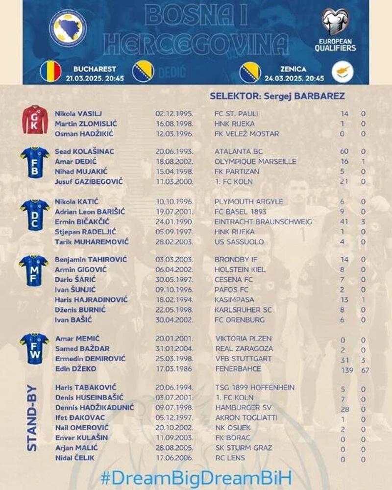 Bosna Hersek Milli Takımı'nın Dünya Kupası elemelerinde Romanya ve Güney Kıbrıs ile oynayacağı maçların aday kadrosu duyuruldu.
