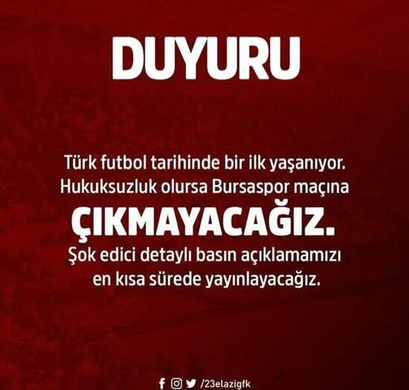 Elazığ FK, Bursaspor maçına çıkmayacaklarını sosyal medya hesaplarından duyurdu.