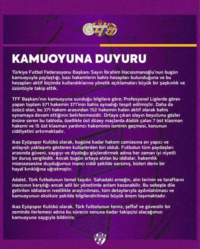 Trendyol Süper Lig kulüplerinden Eyüpspor, Türkiye Futbol Federasyonu (TFF) Başkanı İbrahim Hacıosmanoğlu'nun profesyonel liglerde görev alan bazı hakemlerin bahis oynadığı yönündeki açıklamalarının hakemlik müessesesine duydukları güveni sarsarak kendilerini hayal kırıklığına uğrattığını bildirdi.