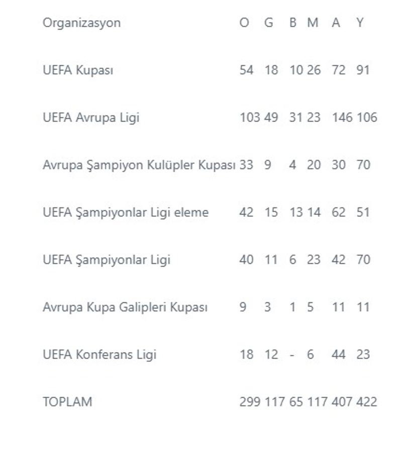 Fenerbahçe'nin Avrupa kupalarındaki performansı şöyle: