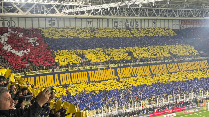 Trendyol Süper Lig'in 14. haftasında Fenerbahçe, sahasında Galatasaray ile karşılaşıyor. Fenerbahçeli taraftarlar, Galatasaray derbisi öncesinde tribünleri dev pankartlar, siluetler ve karton şovlarla donatarak etkileyici bir koreografi sergiledi.