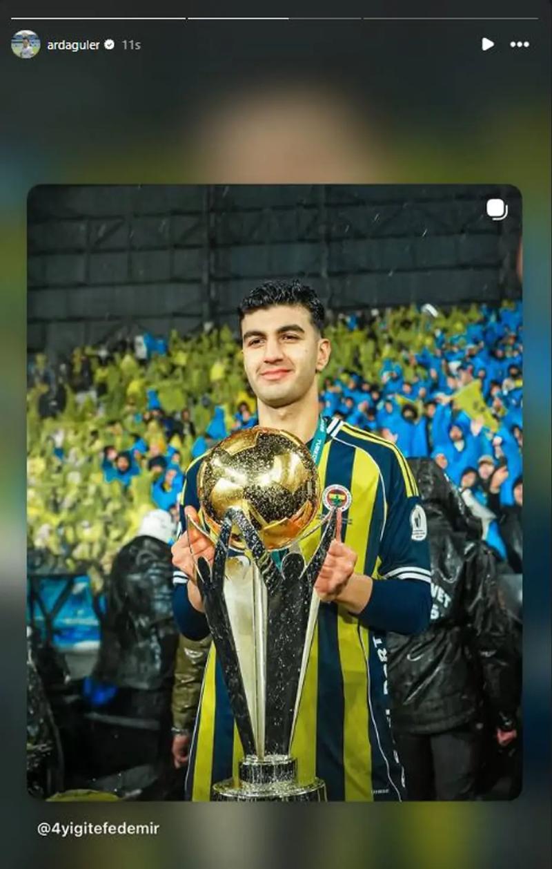Fenerbahçe'nin Süper Kupa şampiyonluğu görselini alıntılayan Arda Güler, Yiğit Efe Demir'in kupayı kaldırdığı fotoğrafı da paylaştı.