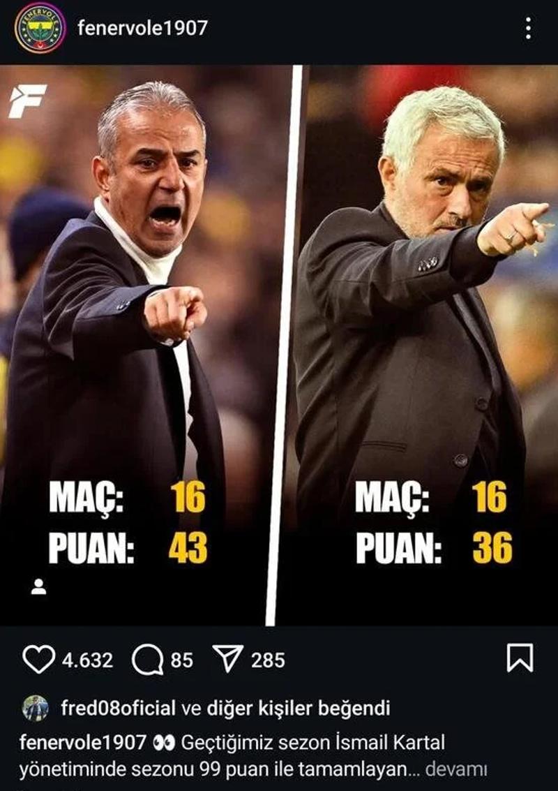 Fenerbahçe'nin Brezilyalı yıldızı Fred, Instagram üzerinden İsmail Kartal ve Jose Mourinho'yu karşılaştıran bir paylaşımı beğendi.