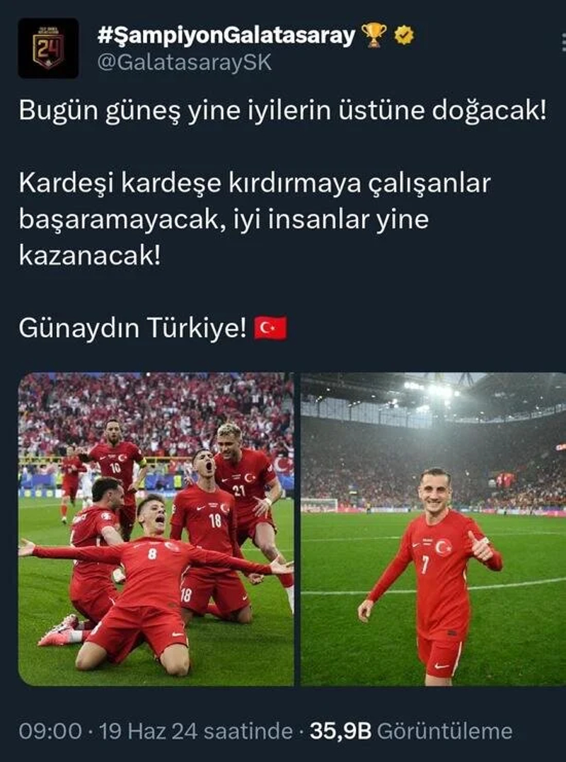 2024 Avrupa Futbol Şampiyonası F Grubu'ndaki ilk maçında A Milli Takım, Gürcistan'ı 3-1 yenerken, Galatasaray bu galibiyetin ardından paylaşımda bulundu.