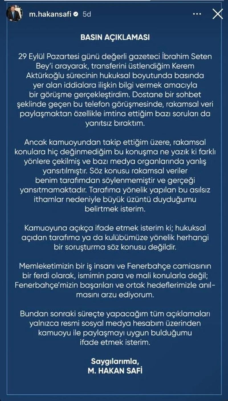 Hakan Safi, sosyal medya hesabından yaptığı açıklamada, Aktürkoğlu'nun transferinin maddiyatı hakkında ifadelerinin çarpıtıldığını söyledi.