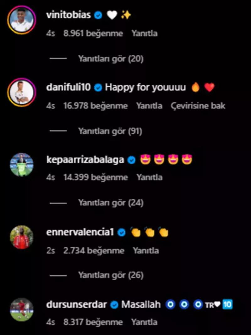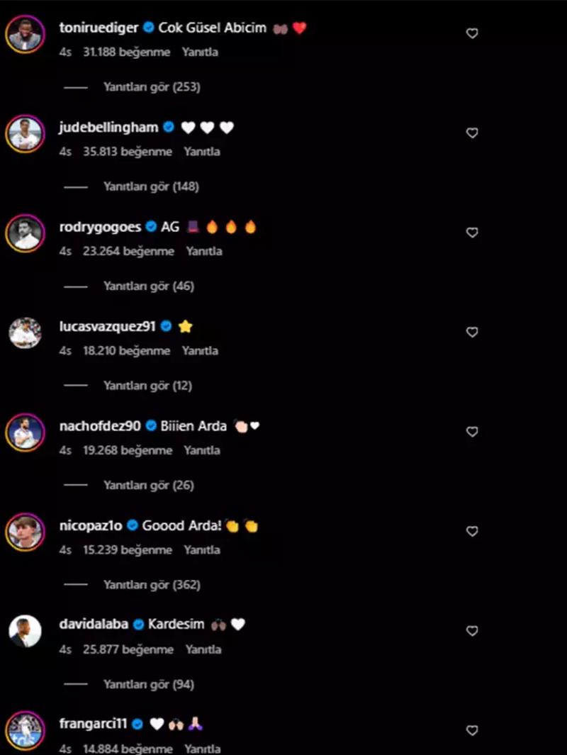 18 yaşındaki futbolcunun paylaşımına gelen yorumlar ise adeta yıldızlar karmasından oluştu. Güler'in neredeyse tüm takım arkadaşları yorum yaparak genç futbolcuya destek oldu.