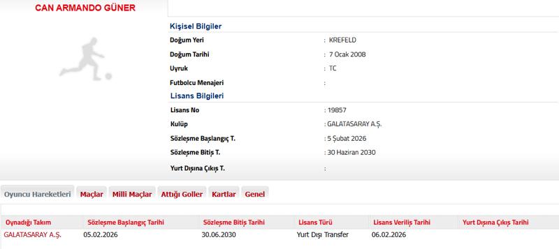 Galatasaray, Can Armando Güner ile 4.5 yıllık sözleşme imzalandığını TFF'ye bildirdi.