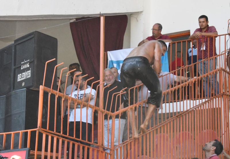 Zaman zaman gergin anların yaşandığı er meydanında, Başpehlivan Yılmaz, hakem heyetinin yanına çıkmak için demirlere tırmandı.