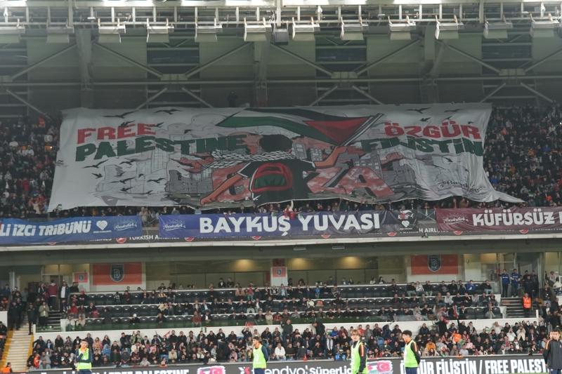Turuncu-lacivertli taraftarlar, tribünde "Özgür Filistin" yazılı pankart açarken Galatasaray taraftarları, "Kahrolsun İsrail, Filistin'e özgürlük" diye slogan attı.