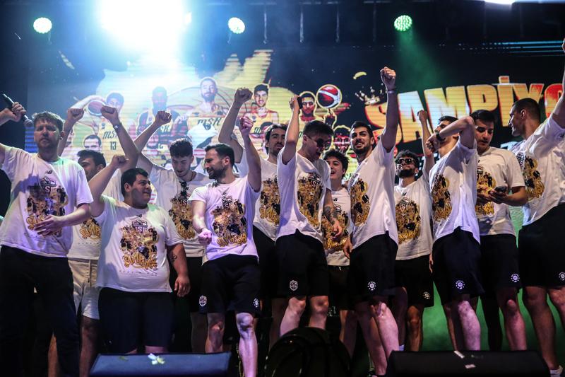 Buradaki kutlamada teknik heyet ve basketbolcular, tek tek anons edilerek kurulan sahneye davet edildi. Alkışlar ve tezahüratlar eşliğinde sahneye gelen oyuncular burada kazandıkları kupayı havaya kaldırdı.