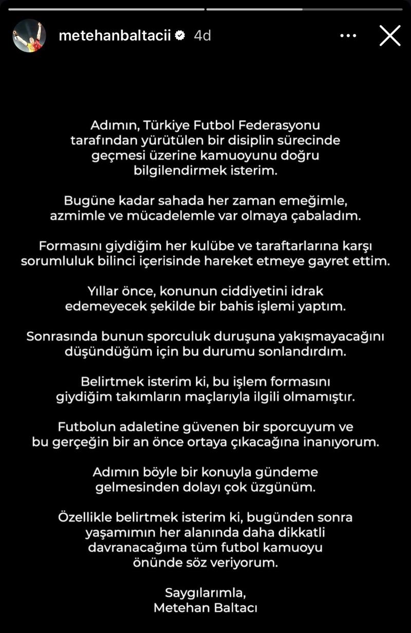 Galatasaray'ın genç savunmacısı Metehan Baltacı, adının Türkiye Futbol Federasyonu'nun açıkladığı "bahis oynayan futbolcular" listesinde yer almasına ilişkin açıklamada bulundu.