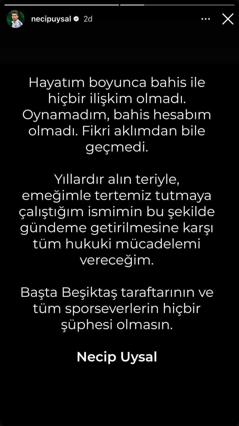 Beşiktaş futbolcusu Necip Uysal, isminin bahis skandalında geçmesinin ardından sosyal medya hesabından açıklama yayınladı.