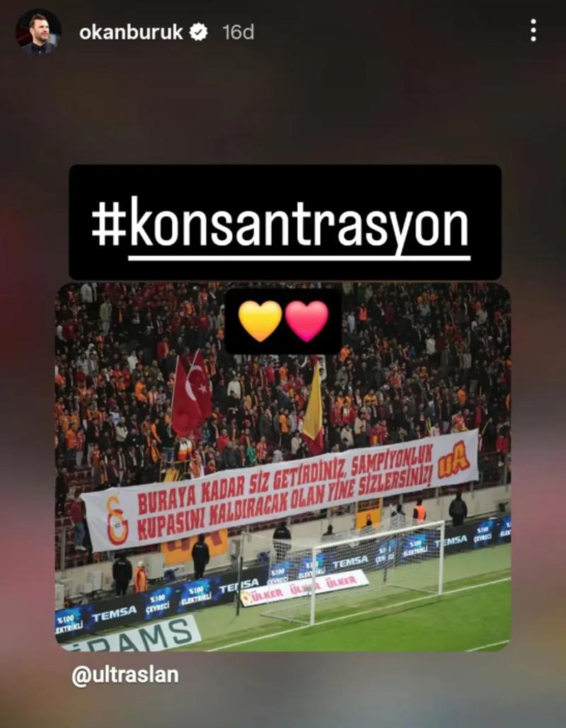 Okan Buruk, Ultraslan taraftar grubunun "Buraya kadar siz getirdiniz, şampiyonluk kupasını kaldıracak olan yine sizlersiniz" yazılı fotoğrafını Instagram hikayesinde paylaştı. Buruk taraftarlara çağrı yaparak, "Konsantrasyon" mesajını yazdı.