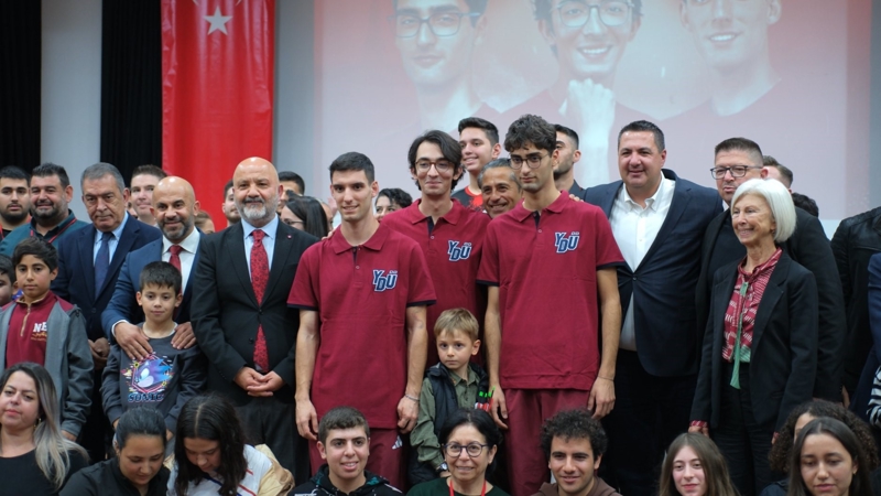 Sporcular, söyleşinin ardından kendilerine hediye edilen Yakın Doğu Üniversitesi tişörtlerini giyerek hatıra fotoğrafı çektirdiler.