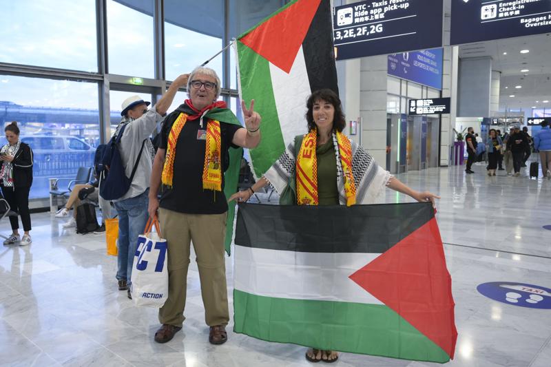 Filistin bayrakları taşıyan grup, havalimanında "Yaşasın Filistin", "Özgür Filistin", "Hepimiz Filistinliyiz", "Yaşasın Filistin halkının direnişi" ve "İşgal son bulsun, İsrail bir terör devleti" sloganları attı.