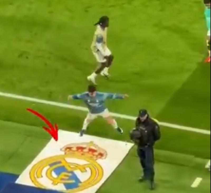 Isınma hareketleri sırasında taç çizgisi kenarına uzaklaşan topu son anda kontrol eden Arda Güler'in, saha kenarındaki Real Madrid armasına basmamak için sarf ettiği çaba bir taraftar kamerasına yansıdı.