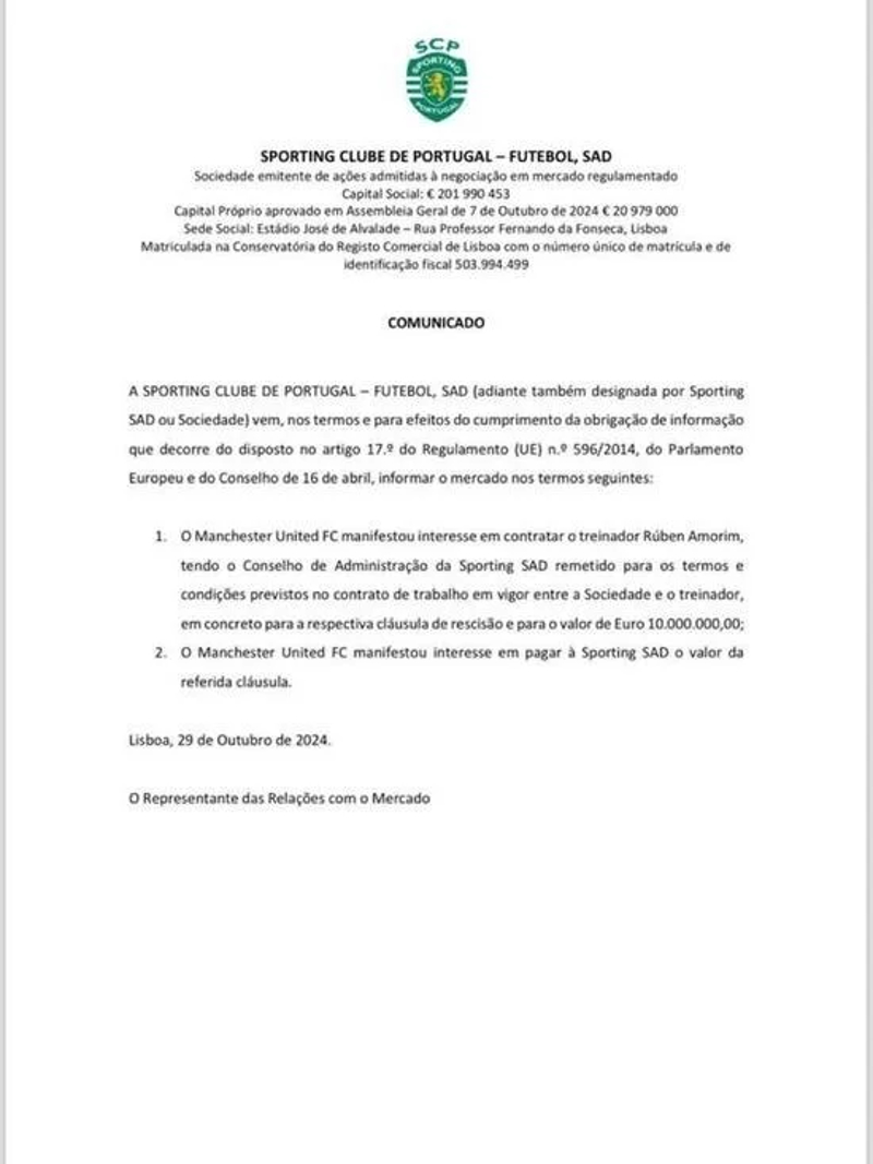 Portekiz ekibi Sporting, Manchester United'ın Ruben Amorim'in serbest kalma maddesini ödemek istediklerini kendilerine bildirdiğini açıkladı.